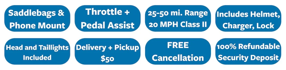 • We rent one bike, the Jones LWB mid-drive electric bicycle. It is Class II / 750W, with a torquey mid-drive motor, a throttle, and 5 levels of pedal assist. Bike specs HERE.