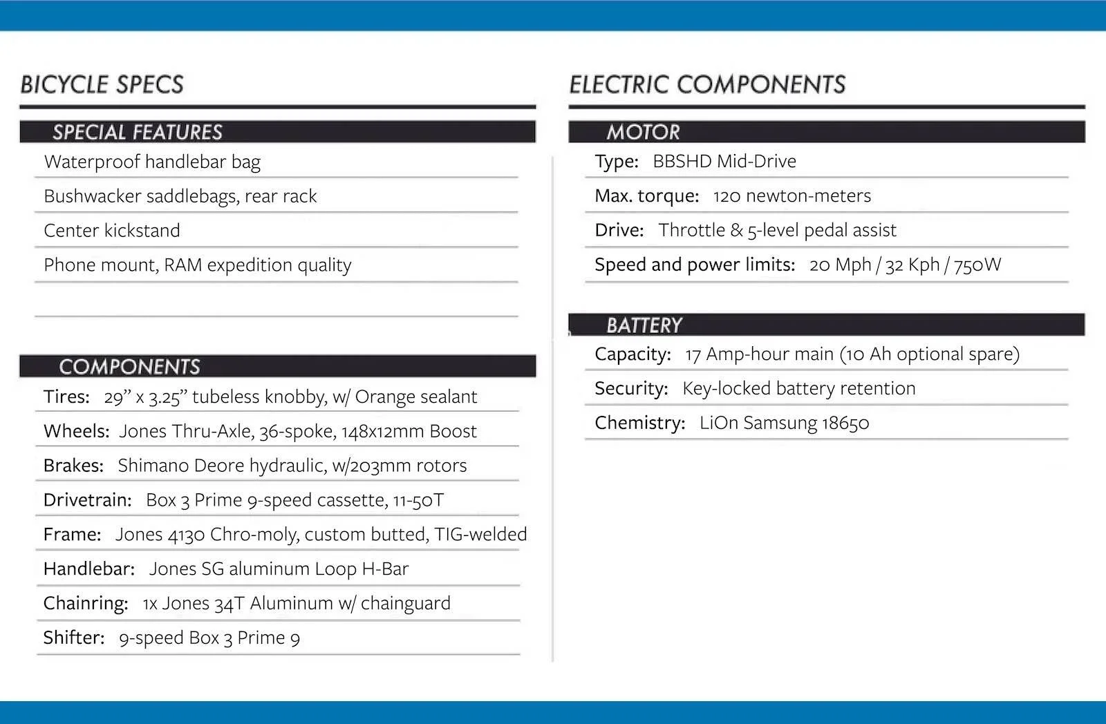 High-torque mid-drive motor | Tubeless tires, 29” x 3.25” | Center kickstand | Handlebar bag | Rear rack with pannier(s) | Phone mount | Hydraulic brakes w/ 203mm rotors | 11-50T range cassette (9 speed) | 5 levels of assist + throttle | Thru-axle wheels